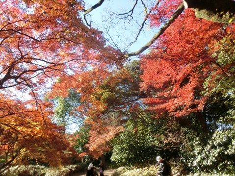 紅葉盛りの奥庭 ここから、池を離れ奥へと入る。これが正解で、紅葉色の樹々が連なっている。テレビの情報に感謝し、見上げながらカメラに収めた。庭園の裏門付近で右折し、樹林帯の道となる。休憩所があり、またベンチに座り休憩。泉水に蓬莱島を探したが、分らずじまい。地図では石組み程度らしい。正門近くにしだれ桜があり、旧同僚グループで夜桜見物に来園したことがあった。何年前かも思い出せない程の過去の話。現在六義園は煉瓦塀に囲まれているが、吉保時代の庭園はもっと広く、明治以降に囲ったとある。正門から御成街道(日光街道)へ出たが、直ぐ不忍通りとなり、三田線千石駅へ歩いた。